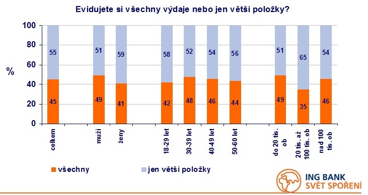 Veškeré výdajové položky si zapisuje 45 % z těch, kdo si evidenci vedou. V rámci této skupiny respondentů jsou podle velikosti bydliště nejpečlivější domácnosti z menších obcí do 20 tisíc obyvatel, kde si udržuje detailní přehled 49 % dotazovaných. Naopak ve větších městech do 100 tisíc obyvatel jejich podíl činí jen 35 %.
