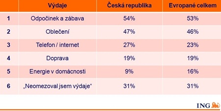 Více než polovina Čechů (54 %) v uplynulém roce omezila své výdaje v oblasti zábavy a odpočinku. Další významnou položkou, kde se domácnosti snažily šetřit, byl nákup oblečení. Obdobně jsou na tom v omezování rozpočtů i naši evropští sousedé. Informace vyplynuly z prosincového mezinárodního průzkumu ING Bank. Češi výrazně častěji než ostatní Evropané hledali možnosti úspory také na telefonních službách a poplatcích za internet. Naopak v okolních zemích lidé v průměru častěji než u nás snižovali výdaje za energie. Téměř třetina dotazovaných Evropanů, včetně obyvatel České republiky, v roce 2012 své výdaje neomezovala vůbec.