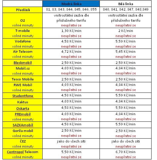 Telefonní čísla, která začínají předčíslím 81, 83, 84 nebo 85, tedy takzvané modré a bílé linky, jsou často mylně považována za bezplatná. Volání na ně je však mnohdy dražší než běžný hovor. „Zákazníka čeká obvykle nepříjemné překvapení při pohledu na fakturu za telefon, hovory se totiž většinou ani nezapočítávají do volných minut. Volné minuty uplatníte pouze u O2,“ říká Miloš Borovička, právní poradce dTestu, a dodává: „Přitom u modrých linek sdílíme náklady na hovor s tím, komu voláme, volání by tedy mělo být oproti jiným hovorům levnější. Ve skutečnosti není.“ Bílé linky slouží jako takzvaná univerzální přístupová čísla. Svůj smysl měla především v době, kdy se rozlišovala místní a meziměstská volání, zákazník volal na bílou linku odkudkoli za stejnou cenu. Dodnes zřejmě přetrvává, že lidé neradi volají na linky začínající předčíslím jiného regionu.