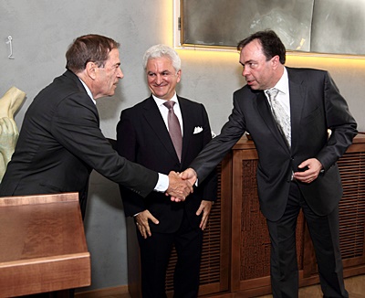 Dominik Štros (vpravo), ředitel nové pojišťovny Colonnade Insurance, vítá na slavnostní recepci u příležitosti uvedení nové značky kanadského velvyslance Otto Jelinka.