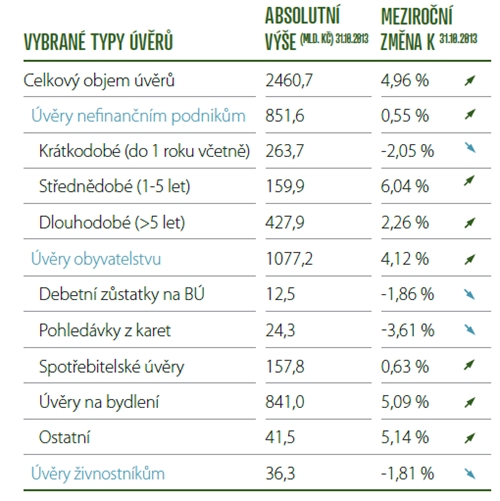Česká ekonomika zaznamenala ke konci října opět pozitivní dynamiku růstu objemu bankovních úvěrů, meziročně o 5 %. V případě úvěrů nefinančním podnikům rostly úvěry do zpracovatelského průmyslu a obchodu, mírně klesly do stavebnictví, dopravy a skladování. Objem úvěrů obyvatelstvu vzrostl ve všech oblastech. „ Říjnová data potvrzují již dříve zaznamenaný trend stabilizace a mírného oživování segmentu spotřebitelských úvěrů. Hlavní roli přesto stále hrají především hypotéky. Celkově úvěry obyvatelstvu rostly o 4,1 %,“ popisuje aktuální data Jan Matoušek, náměstek výkonného ředitele ČBA. Objem poskytnutých úvěrů živnostníkům se v poslední době stabilizuje na hodnotě nad 36 miliardami korun.