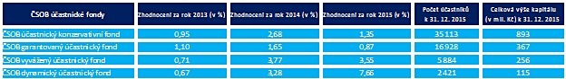 Důvodů, proč se účastnickým fondům od ČSOB, a zejména těm dynamičtějším dařilo, je několik. V případě dynamičtějších účastnických fondů to byl růst cen akcií v roce 2015 a posilování amerického dolaru vůči české koruně. U konzervativnějších pak pozitivní výkonnost českých státních dluhopisů a korporátních dluhopisů v portfoliích všech účastnických fondů. V neposlední řadě pak k zajímavému zhodnocení prostředků našich klientů přispěla správná identifikace aktiv s růstovým potenciálem a aktivní správa portfolia v roce 2015.