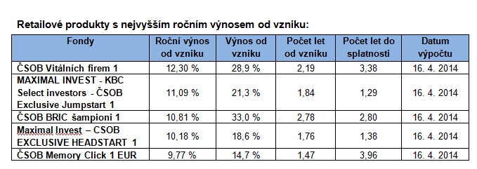 Průměrný výnos zajištěných a strukturovaných fondů ČSOB před splatností dosahuje od svého vzniku hodnoty 4,75 % ročně (odpovídá 5,58 % na depozitech před zdaněním). Nejvyšší roční výnos od vzniku si na konci března připsal fond ČSOB Vitálních firem 1 – 12,30 %.