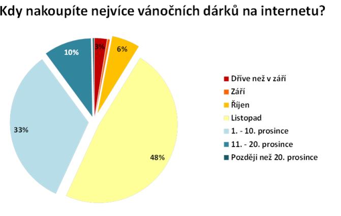 Na otázku, kdy nakoupí většinu vánočních dárku na internetu, odpovědělo 10 % dotazovaných pro někoho překvapivě – již do konce října. Hlavní část objednávek pak na e-shopy čeká v průběhu listopadu, kdy plánuje mít nakoupeno celkem 57 % zákazníků. Dalších 33 % spotřebitelů pak odešle svůj nákupní košík mezi 1. a 10. prosincem.