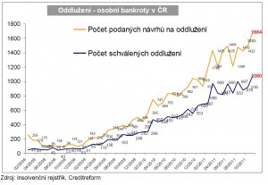 Celkový počet insolvenčních návrhů u fyzických osob přesáhl již v listopadu úroveň roku 2010 o 50,5%. V listopadu 2011 bylo podáno celkem 2335 insolvenčních návrhů. Z toho bylo 574 insolvenčních návrhů podáno na firmy – podnikatele a 1761 návrhů na fyzické osoby – spotřebitele.