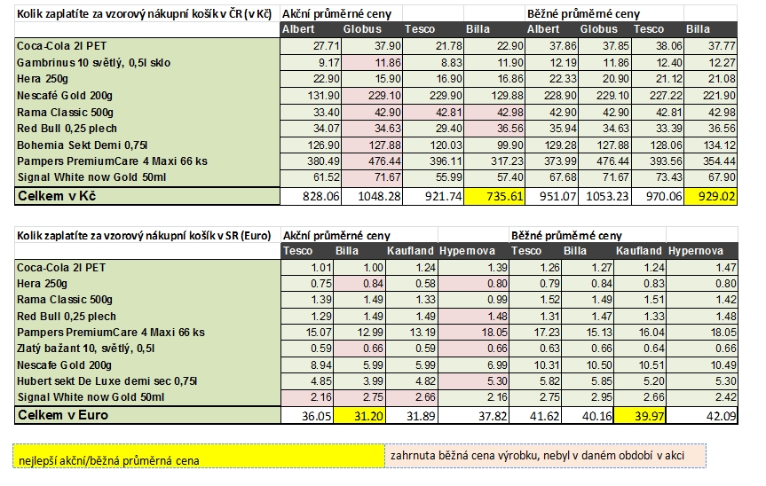S počátkem října začala česko-slovenská agentura Sales House s.r.o. opět monitorovat výskyt akčních cen vybraných položek ve vzorovém spotřebním košíku. Porovnáme-li Česko vs. Slovensko, je patrné, že během října byl výskyt akčních cen vyšší na Slovensku, kde v průměru 17,5 % vybraných položek na řetězec bylo v akci, oproti 16 % v Česku. V ČR tento průměr jasně navýšily řetězce Tesco a Billa, které měly zhruba čtvrtinu sledovaných položek v akci. Na Slovensku všechny jasně předčil Kaufland s 26 % akčních položek. Nejvíce akční položkou v ČR byly dětské pleny Pampers Premium Care 4 Maxi 66 ks, které téměr v polovině (48 %) všech sledovaných řetězců byly v akci. Na Slovensku to byl pak Hubert sekt De Luxe demi sec 0,75l, který byl v akci téměř ze 40 %. Nejlépe jsme vzorový nákupní košík v Česku nakoupili v Bille, a to jak v akčních, tak běžných cenách. Na Slovensku pak v Bille v akčních cenách a v Kauflandu v běžných cenách.